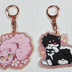 ・桜イメージのわたわたねこアクキー ・桜とちょうちょのはたたわんこアクキー 50×50(mm)の原稿で作成しております。 片面印刷です。 カット部分の面に茶色の焦げ模様が入るのは使っているアクリルの仕様らしいです。